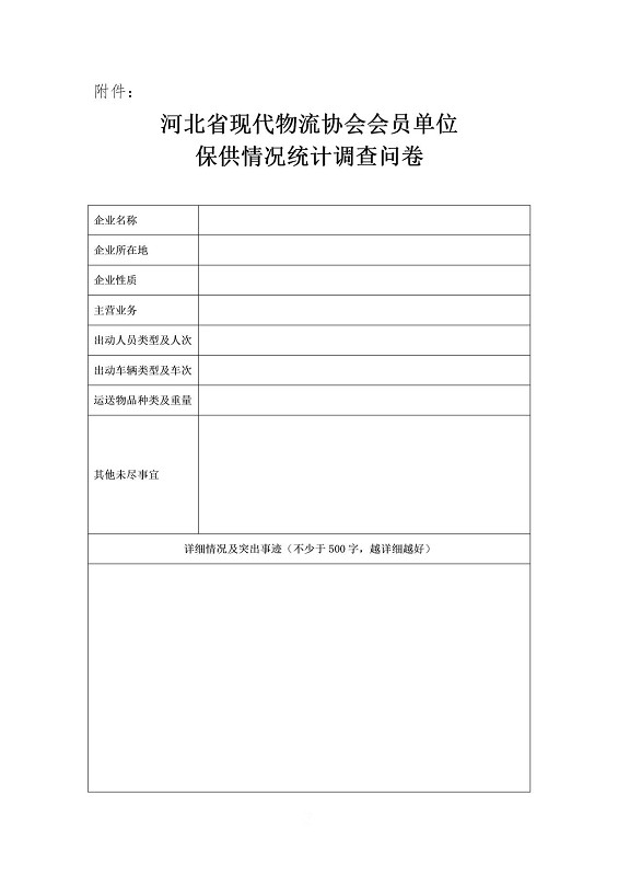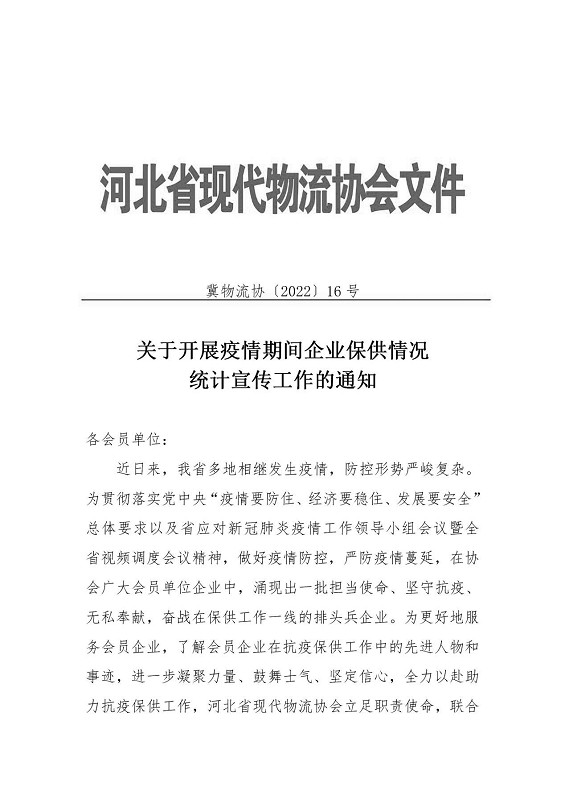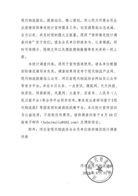 近日来,河北省多地相继发生新冠疫情。防疫保供成为防疫情、稳经济和安全发展的重中之重。在防疫保供中,河北物流领域涌现出一批担当使命、无私奉献、奋战坚守在抗疫一线的先进企业和人物。为凝聚力量、鼓舞士气、坚定信心,河北省现代物流协会与《现代物流报》社通过“保供情况统计调查问卷”方式,联合开展河北省现代物流协会会员企业疫情保供事迹统计宣传服务活动,以凝聚众志成城、全力以赴、共克时艰的强大正能量。