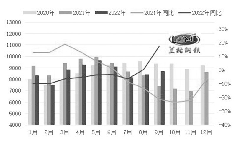 从累计产量来看,仍呈现同比下降局面。1~9月,我国生铁产量65610万吨,同比下降2.5%;粗钢产量78083万吨,同比下降3.4%;钢材产量100585万吨,同比下降2.2%。