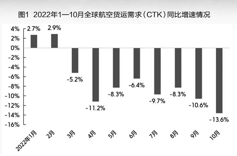 2022年1~10月全球航空货运需求(CTK)同比增速情况