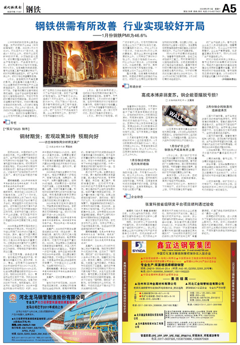 从中物联钢铁物流专业委员会调查、发布的钢铁行业PMI(采购经理指数)来看,2023年1月份为46.6%,环比回升2...