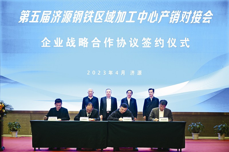 本报讯 (记者何文忠摄影报道)4月12日,第五届济源钢铁区域加工中心产销对接会召开。济源钢铁与战略合作企业东北大学冶金学院特殊钢冶金研究所、北京宝维森新材料科技发展有限公司、无锡鑫润辉弹簧科技有限公司签约。河南省工信厅二级巡视员翟贵平,河南省“万人助万企”第十八服务工作组组长、河南省政府国资委正厅级干部王哲,济源市副市长王笑非、济源钢铁董事长李玉田见证签约。