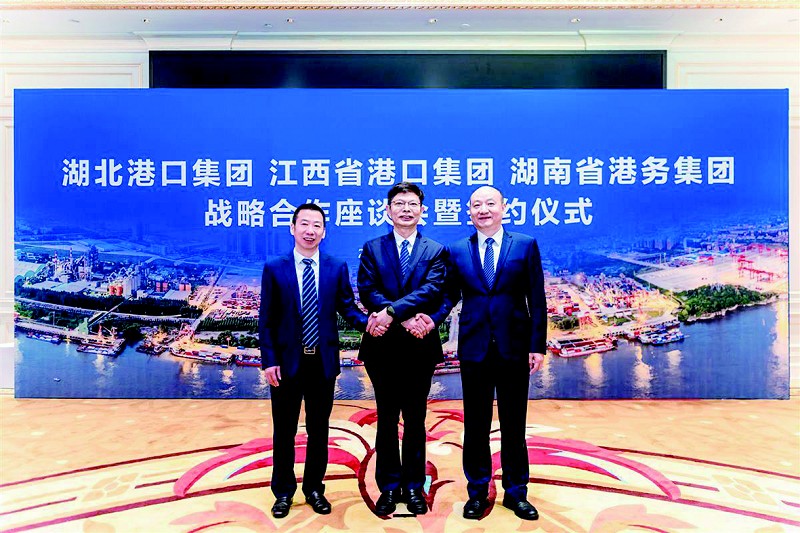 本报讯日前,湖北港口集团与江西省港口集团、湘水集团湖南省港务集团在武汉签署战略合作协议。 根据协议约定,三方将有效执行《长江中游三省融入共建“一带一路”新格局的协议》,打造长江中游城市群“组合港”,坚持优势互补、资源互享、发展互惠的原则,搭建三省之间运输、物流及贸易通道,推动三方业务共同增长,带动区域经济发展,服务一系列国家重大战略,为中部地区经济发展和维护三省产业链供应链稳定提供重要支撑。