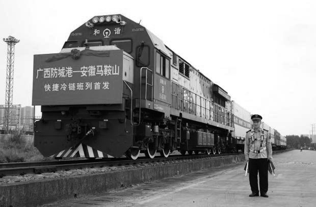 本报讯5月6日上午,广西防城港至安徽马鞍山的快捷冷链班列首发仪式在防城港市成功举行。该冷链班列的开通正式打开了广西北部湾国际生鲜冷链园区冷链物流海铁联运通道的服务新渠道,是广西现代物流集团、广西供应链服务集团携手防城港市共同打造现代流通主渠道,服务国家构建新发展格局的又一生动实践。