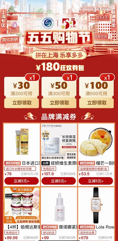 作为上海首创的大规模消费活动,“五五购物节”贯穿二季度劳动节、儿童节、端午节等多个节日,拼多多还积极参与上海数字生活节、绿色消费季、制造佳品汇、信息消费节、邻里生活节等五五购物节IP活动,并结合具体场景打造一系列定制化大促,拉动消费持续增长。