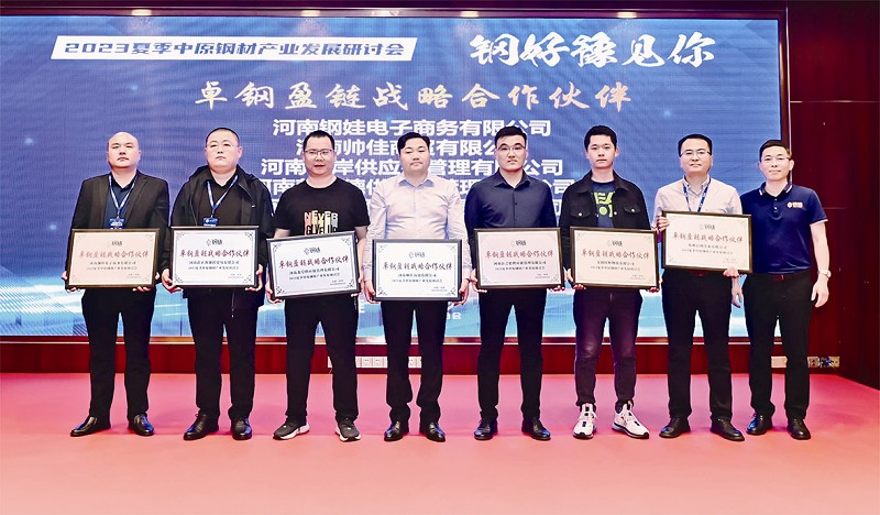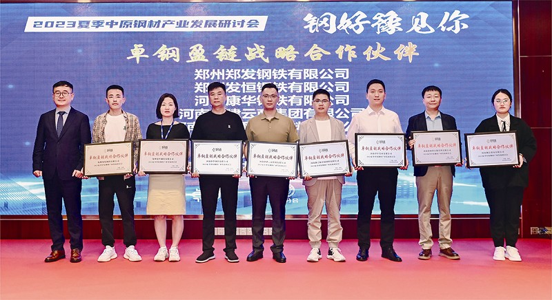 活动现场,主办方为河南地区合作伙伴颁发了牌匾。郑州郑发钢铁、郑州发恒钢铁、河南康华钢铁、河南中建云商集团、河南钢之顺金属、河南中军实业等15家企业被授予“卓钢盈链战略合作伙伴”的荣誉。