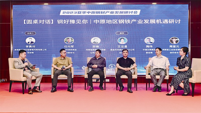 郑州市钢贸商会常务副会长任向军、河南鼎鼎实业有限公司总经理苏锋、紫金天风期货河南分公司总经理王亚星、中建云商集团副总裁陶伟、河南省工业协会钢贸分会执行会长周奎元等齐聚一堂,大家从“中原地区钢铁产业供需格局”“钢铁流通领域转型的方向”“钢铁盈利变化与供应格局”“供需再平衡,钢铁产业链的重生之路在哪”等角度进行了探讨、分析和研判。
