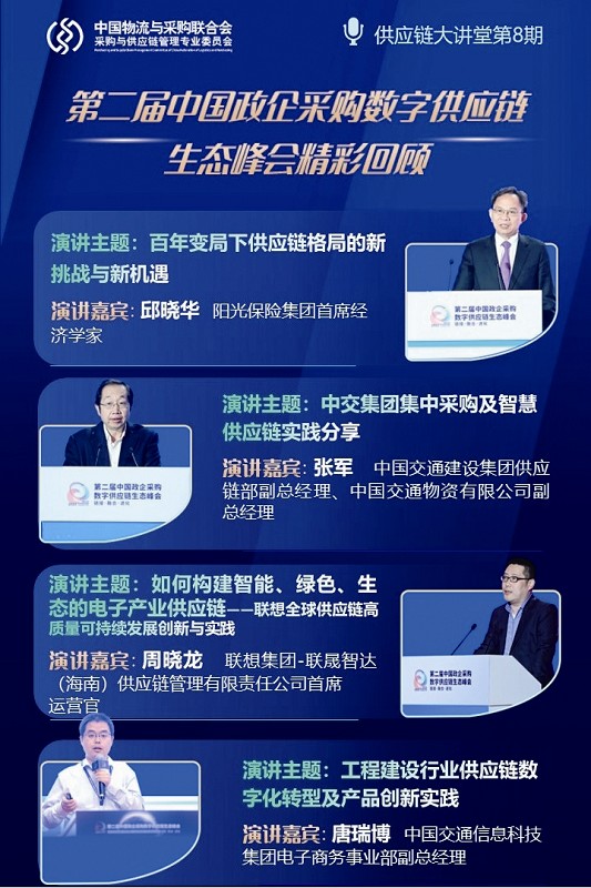 本报讯 (记者马敬泽)5月31日,由中物联采购与供应链管理专业委员会主办的第八期“供应链大讲堂”在线上举行。本次直播活动呈现了5月10日“第二届中国政企采购数字供应链生态峰会”中阳光保险集团首席经济学家邱晓华,中国交通建设集团供应链部副总经理、中国交通物资有限公司副总经理张军,联想集团-联晟智达(海南)供应链管理有限责任公司首席运营官周晓龙,中国交通信息科技集团电子商务事业部副总经理唐瑞博四位嘉宾的精彩演讲,对当前采购与供应链领域的最新行业动态进行分享与解读。