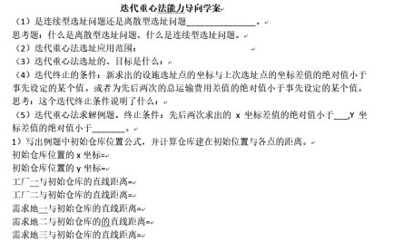 每堂课会按能力要求,对知识点进行拆分与整合,形成学案,课前发给学生。下面以迭代重心法选址进行分析。案例及能力导向学案如图1~图3所示。(二)问题引导式教学
