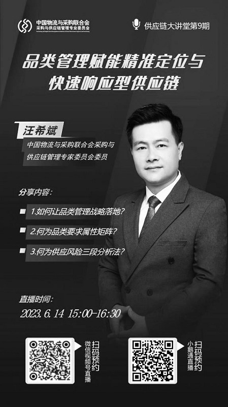 本报讯 (记者马敬泽)6月14日,由中物联采购与供应链管理专业委员会主办的第九期“供应链大讲堂”在线上举行。本次讲座邀请中物联采购与供应链管理专家委员会委员、中国石化联合会供应链工作委员会核心专家汪希斌,以“采购品类管理赋能精准定位与快速响应供应链”为题,围绕采购品类管理的重要性、如何让采购品类管理战略落地等内容进行分享。