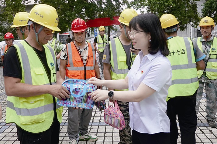 本报讯 (通讯员胡智慧毛金凤摄影报道)7月19日,中国十七冶集团安徽省马鞍山市花山区2023年解放路街道老旧小区整治工程项目经理部——康城花园老旧小区改造项目临时党支部开展“党建共建送清凉同心协力保安全”党建共建活动。花山区住房管理服务中心主任殷俊,解放路街道党工委书记王海军,中国十七冶集团南京分公司纪委书记、工会主席张忠,阌家山社区党委书记谢德燕给奋战在一线的施工人员发放了矿泉水、西瓜、药品等防暑降温物品,叮嘱大家在高温天气注意做好防暑降温工作、切实保护好身心健康。