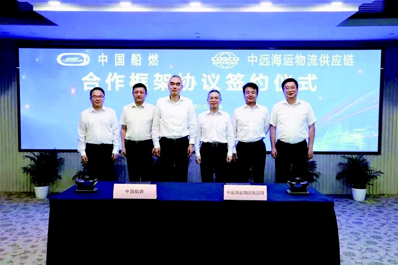 本报讯 7月21日,中国船燃与中远海运物流供应链有限公司在北京举行项目合作框架协议签约仪式。中国船燃总会计师胡博惺、中远海运物流供应链党委副书记张燕松分别代表双方签署合作协议。