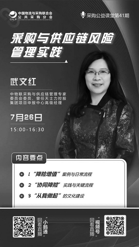 本报讯 (记者马敬泽)7月26日,由中物联公共采购分会、采购与供应链管理专委会主办的第四十二期“采购公益课堂”在线上举行。本次线上直播邀请中物联采购与供应链管理专家委员会委员、原天士力控股集团项目申报中心高级经理武文红,对企业如何进行采购与供应链风险管理进行讲解。