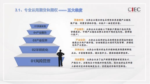 如果能够分清楚发现价格和套期保值,衍生品是能够帮我们来做一些事情的。从下而上一二三四五能够做五个维度的事情。五个维度的事情它是先做一再做二,不可能说一没做好,直接跳上去做五,个人认为做好的可能性是不大的。从一到五大概有这么五点。