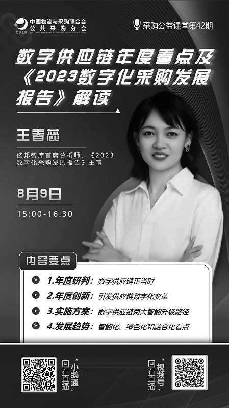 8月9日,由中物联公共采购分会、采购与供应链管理专委会主办的第四十二期“采购公益课堂”在线上举行。本次线上直播邀请亿邦智库首席分析师、《2023数字化采购发展报告》主笔王春蕊,对我国数字供应链年度看点与《2023数字化采购发展报告》进行解读,揭示我国数字供应链的发展现状与前景,为企业提升供应链数字化水平提供指导。