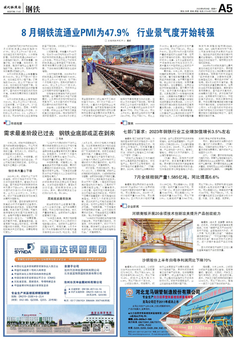 □兰格钢铁研究中心 葛昕 兰格钢铁网统计发布的2023年8月份钢铁流通业PMI总指数为47.9%,较上月上升0.8个...