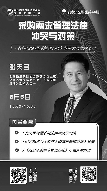9月6日,由中物联公共采购分会、采购与供应链管理专委会主办的第四十四期“采购公益课堂”在线上举行。本次线上直播邀请东北财经大学教授、全国政府采购协会联席会议主席、全国人大立法联络员、《政府采购法》起草人之一张天弓,以“采购需求管理法律冲突与对策”为主题,从“采购需求与法律冲突概述”“采购需求管理法律冲突及其对策”“《政府采购需求管理办法》概述”“《政府采购需求管理办法》重点难点条款解读”等方面,对《政府采购需求管理办法》等相关法律进行专业解读。