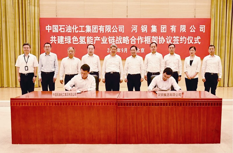 本报讯9月13日,河钢集团与中国石油化工集团(以下简称中国石化)在北京签署共建绿色氢能产业链战略合作框架协议。河钢集团党委书记、董事长于勇与中国石化党组书记、董事长马永生围绕推动