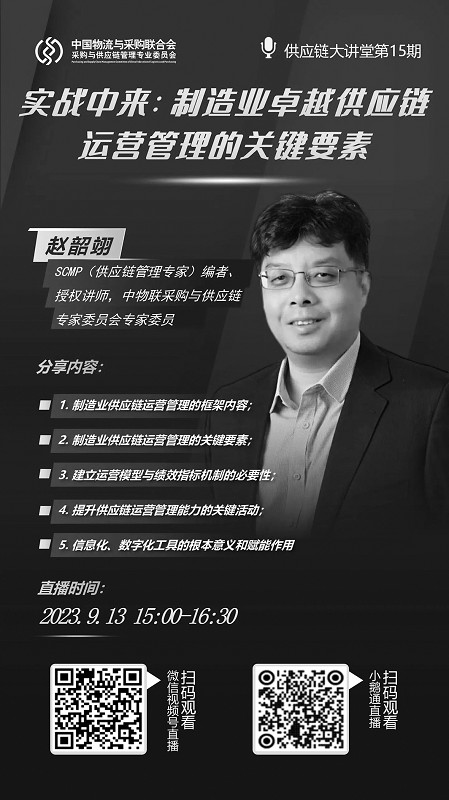 9月13日,由中国物流与采购联合会采购与供应链管理专业委员会主办的第十五期“供应链大讲堂”系列直播在线上举行。邀请“供应链管理专家”(SCMP)编者、授权讲师,中物联采购与供应链专家委员会委员赵韶翊,以“实战中来:制造业卓越供应链运营管理的关键要素”为题,围绕“制造业供应链运营管理的框架内容”“制造业供应链运营管理的关键要素”“建立运营模型与绩效指标的必要性”等内容进行讲解。