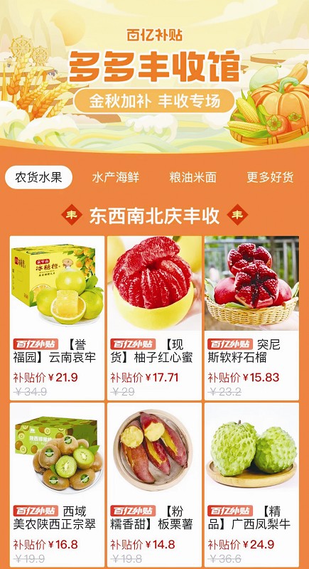 9月15日,拼多多正式上线“多多丰收馆”,投入10亿元资源包,联合平台30万涉农商家与全国超1000个农产区共庆丰收。同时,百亿补贴也将对入驻“丰收馆”的米面粮油、肉禽蛋奶、蔬菜水果等农副产品进行全面覆盖,进一步促进各地农产品直连广大消费者,助力农户丰产增收,推动农产品产业带提质增效,实现有质量的增长。