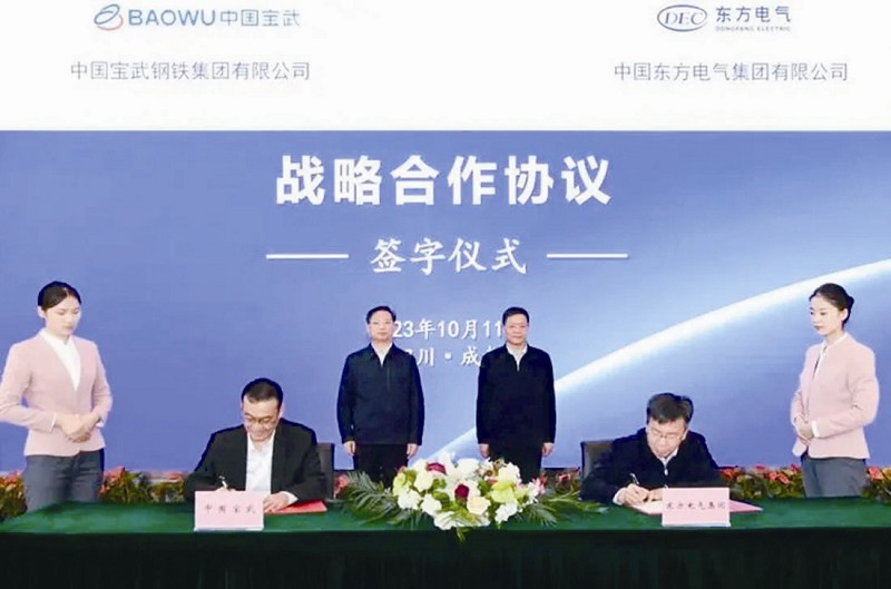 本报讯10月11日,中国宝武与东方电气在成都签署战略合作协议。双方将以此为契机,加强交流合作,进一步提升产业链供应链韧性,促进绿色低碳转型发展。中国宝武党委书记、董事长胡望明,东方电气党组书记、董事长俞培根见证签约。