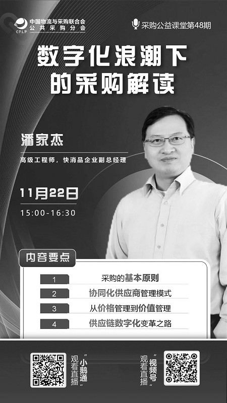 本次直播通过“小鹅通”网络直播平台及“中物联公共采购分会”视频号同步进行,邀请快消品企业副总经理、高级工程师潘家杰,围绕“数字化浪潮下的采购解读”这一主题,从“采购的基本原则”“协同化供应商管理模式”等多个方面进行讲解。