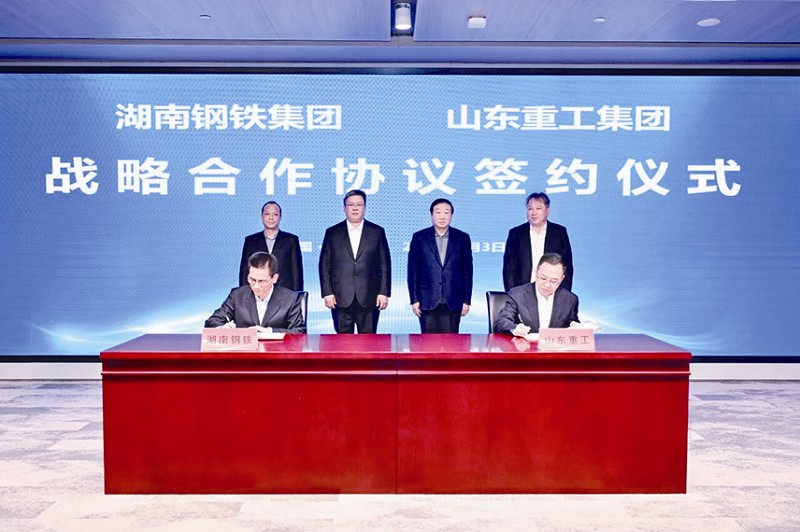本报讯1月3日,湖南钢铁集团与山东重工集团在山东济南签署战略合作协议。湖南钢铁集团党委书记、董事长李建宇,山东重工集团党委书记、董事长,潍柴集团董事长,中国重汽集团董事长谭旭光座谈并见证签约。