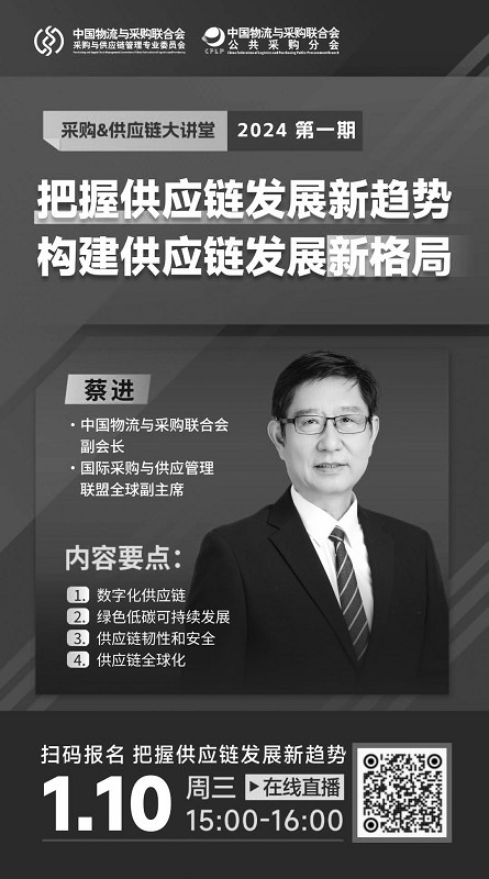 1月10日,由中国物流与采购联合会公共采购分会和采购与供应链管理专委会联合主办的2024年“采购&供应链大讲堂”直播活动正式开讲。该系列直播将往年“采购公益课堂”“供应链大讲堂”系列直播活动进行整合,将于每周三下午三点在“中物联采购委”微信公众号上进行直播。