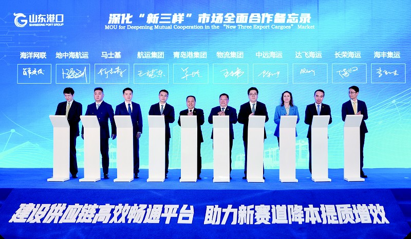 马德亮介绍了山东港口供应链综合服务体系并发布合作倡议,将以“供应链综合服务体系建设”为总抓手,与各大船公司联手推进集装箱一体化,实现新布局、新协同、新能力、新市场、新业态,全面提升港航服务能级,共同维护产业链供应链稳定畅通。山东港口集装箱运营中心推介山东港口集装箱一体化发展举措,介绍未来合作方向,将全力为航运公司在山东口岸发展创造更好环境。山东港口青岛港、物流集团、航运集团与中远海运、马士基、达飞海运、地中海航运、长荣海运、海洋网联、海丰集运7家船公司签署《深化“新三样”市场全面合作备忘录》,将致力于推进新质生产力发展,合力打造竞争新优势。