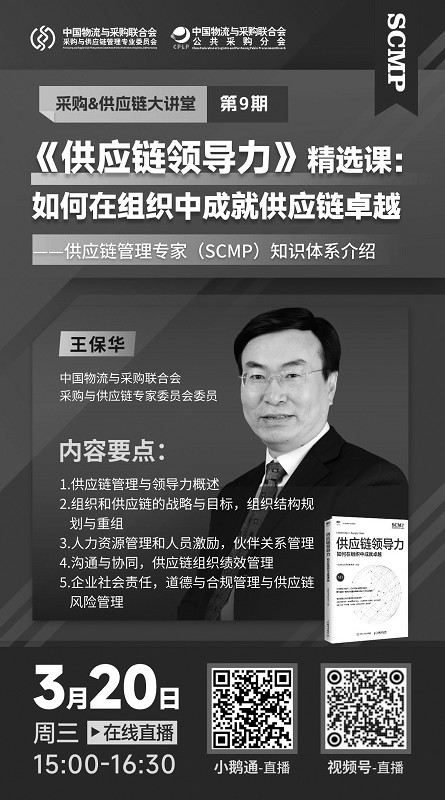 本期直播是“供应链管理专家(SCMP)”知识体系精选课系列第3讲,邀请中国物流与采购联合会采购与供应链专家委员会委员王保华,以“《供应链领导力》精选课:如何在组织中成就供应链卓越——供应链管理专家(SCMP)知识体系介绍”为题,对《供应链领导力》一书的章节构成与内容进行解析。