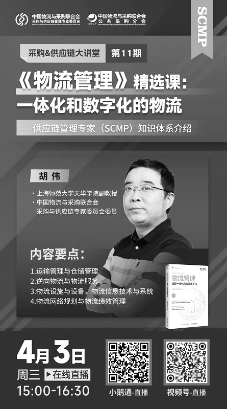 本期直播是“供应链管理专家(SCMP)”知识体系精选课系列第4讲,邀请上海师范大学天华学院副教授、中物联采购与供应链专家委员会委员胡伟,以“《物流管理》精选课:一体化和数字化的物流”为题,对《物流管理》一书的章节构成与内容进行解析。