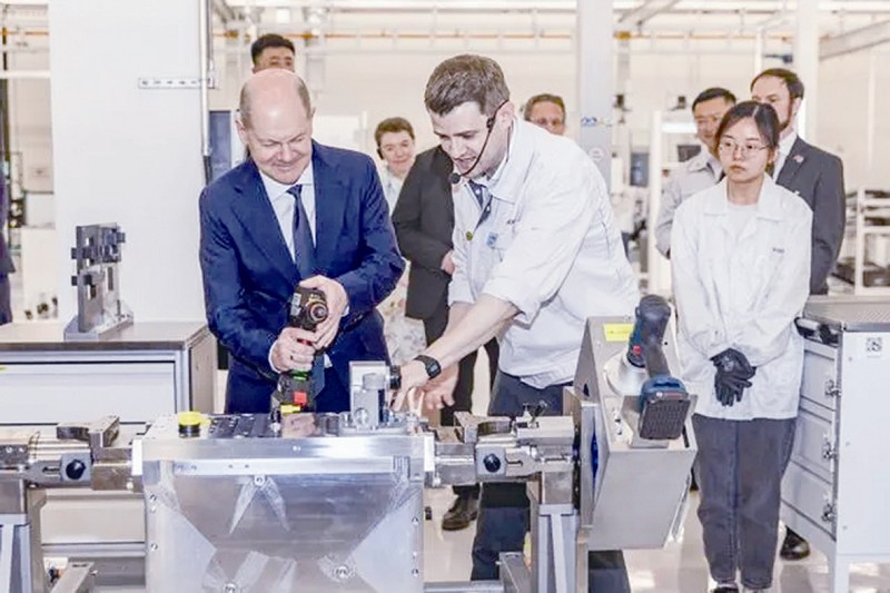 朔尔茨访华首站来到有着德资背景的博世氢动力系统(重庆)有限公司(德国世界五百强企业博世集团与中国合作的氢动力系统生产企业),参观该企业研发生产的氢动力产品及氢燃料电池解决方案,认真听取了现场工作人员的介绍,并体验了氢动力模块的装配。