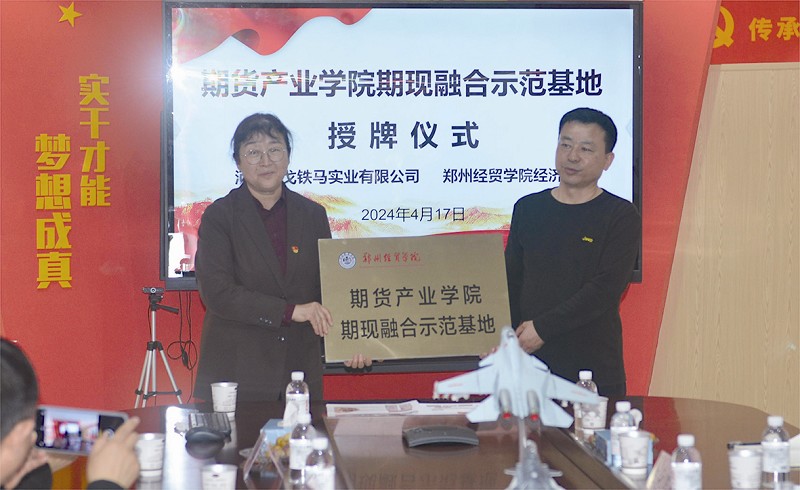 郑州经贸学院经济学院院长牛艳莉对金马市场给予研学活动的大力支持表示感谢,并对金马集团总经理黄涛的成功事迹高度褒奖。“学以致用,期现融合”。牛艳莉代表该校经济学院向黄涛授牌,标志着“期货产业学院期现融合示范基地”在新金马正式启动。