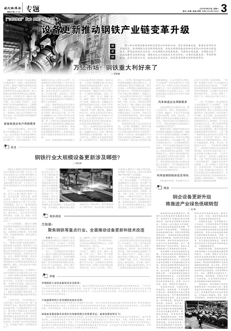 新一轮大规模设备更新和消费品以旧换新行动,将拉动设备制造、装备制造等终端用钢需求,推动钢铁行业实现升...