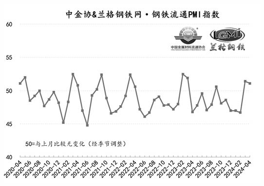 中国金属材料流通协会、兰格钢铁网联合发布的2024年4月份中金协&兰格钢铁网·钢铁流通PMI指数为51.1%,较3月下降0.3个百分点,在扩张区间内略有回落。从分类指数看,构成PMI指数的10个分类指数7升3降,其中销售量、销售价格、总订单量、采购成本、到货速度、融资环境和企业雇员7项指数上升,库存水平、走势判断和采购意愿3项指数下降。