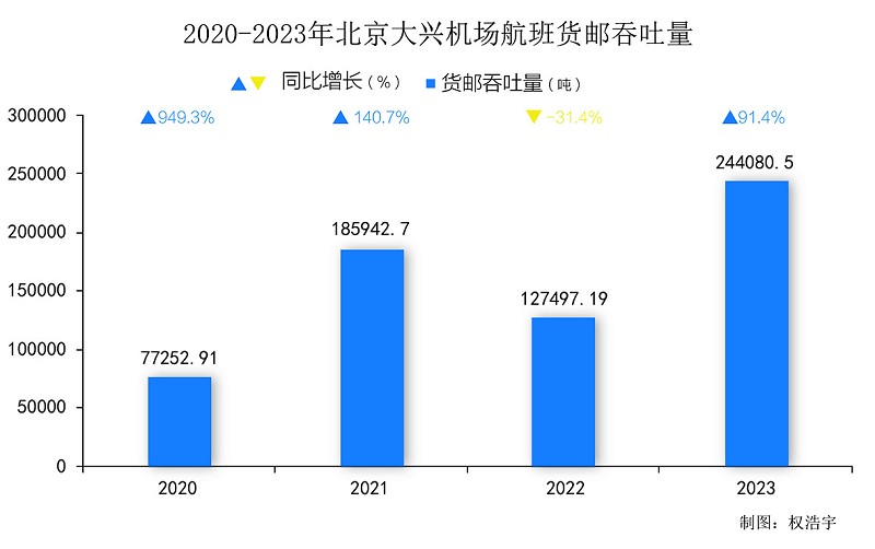 据统计,2023年北京大兴机场完成货邮吞吐量244080.5吨,相比2022年同期增长了116583.31吨,同比增长91.4%,2023年北京大兴机场货邮吞吐量位列全国第17名。