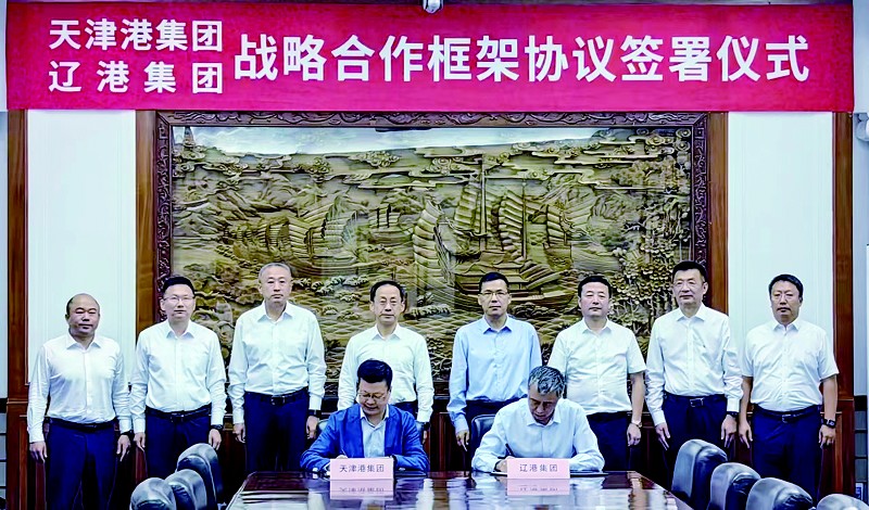本报讯6月21日,辽港集团与天津港集团在大连签署战略合作框架协议,旨在深化航线开发、全程物流服务、智慧绿色港口建设等方面的合作。辽港集团党委书记、首席执行官王志贤与天津港集团党委书记、董事长褚斌共同出席签约仪式。