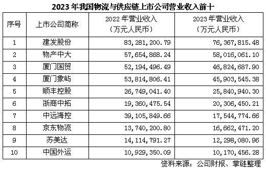 2023年我国物流与供应链领域营业收入排名前十的上市公司营业收入合计3.3万亿元,占全行业上市公司营业收入的72.51%。其中,6家为大宗商品供应链服务类上市公司。