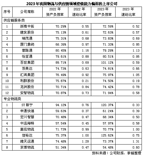 全行业16家企业资产负债率超过70%,偿债能力偏弱,涉及供应链服务类企业12家,专业物流服务类企业4家。全行业12家企业速动比率低于0.7,短期流动性偏弱,涉及供应链服务类企业7家,专业物流服务类企业5家。