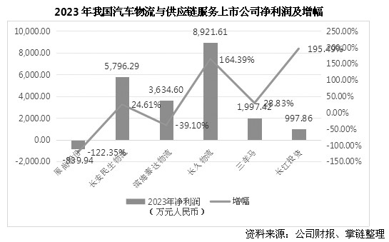 根据中汽协数据统计,2023年,中国汽车产销分别为3016.1万辆和3009.4万辆,同比分别增长11.6%和12%。伴随汽车行业增长机遇,大部分汽车物流与供应链服务企业净利润大幅增加。2023年长久物流实现净利润8921.61万元,同比上升164.39%,长江投资实现净利润997.86万元,同比上升195.49%。