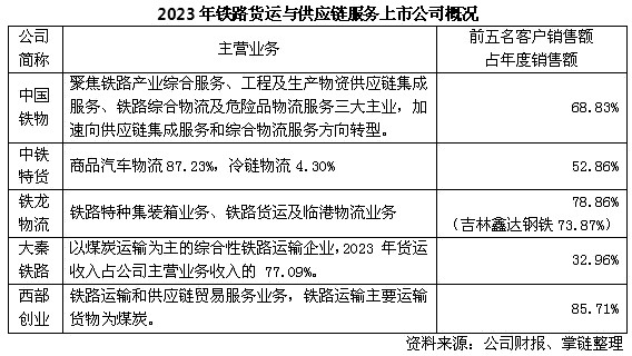 铁路货运与供应链服务上市公司共有5家,服务客户群体较为集中,前五名客户销售额占年度销售额比例均超过30%,其中,铁龙物流、西部创业前五名客户销售额占年度销售额比例分别为78.86%和85.71%。