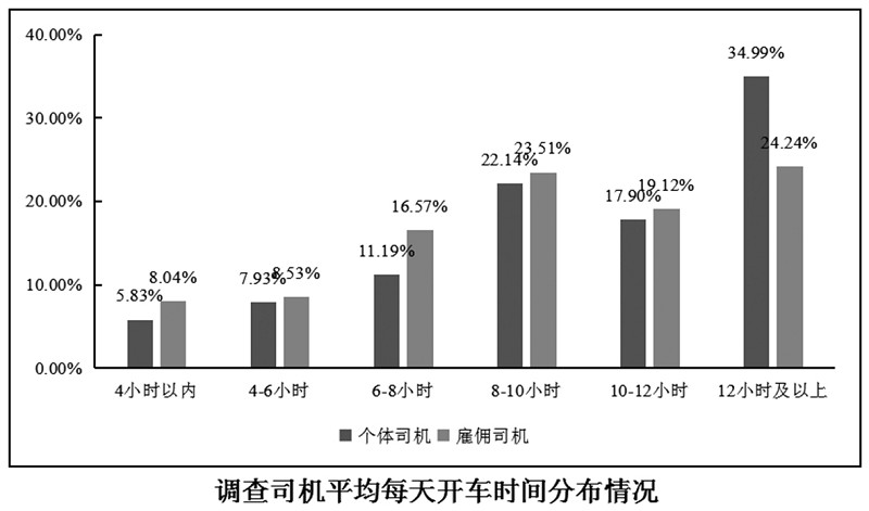 调查数据显示,货车司机工作时间普遍较长。个体司机和受雇司机每天开车10个小时及以上的分别占52.89%、43.36%,开车时间12小时 及 以 上 的 分 别 占 34.99%、24.24%。个体司机较受雇司机驾驶时间总体更长,劳动强度大。