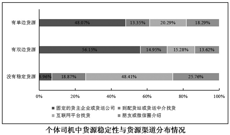 调查数据显示,没有稳定货源的货车司机中,近一半更偏向通过互联网平台找货。对于有单边或双边货源的司机,主要仍然是以固定的货主企业或货运公司为主。