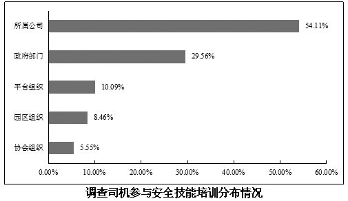 调查数据显示,近七成的货车司机参加过安全技能培训,其中54.11%的司机参加其所属公司的组织培训,29.56%的司机参加政府部门组织的培训,还有部分司机参与了平台、园区和协会组织的安全技能培训。