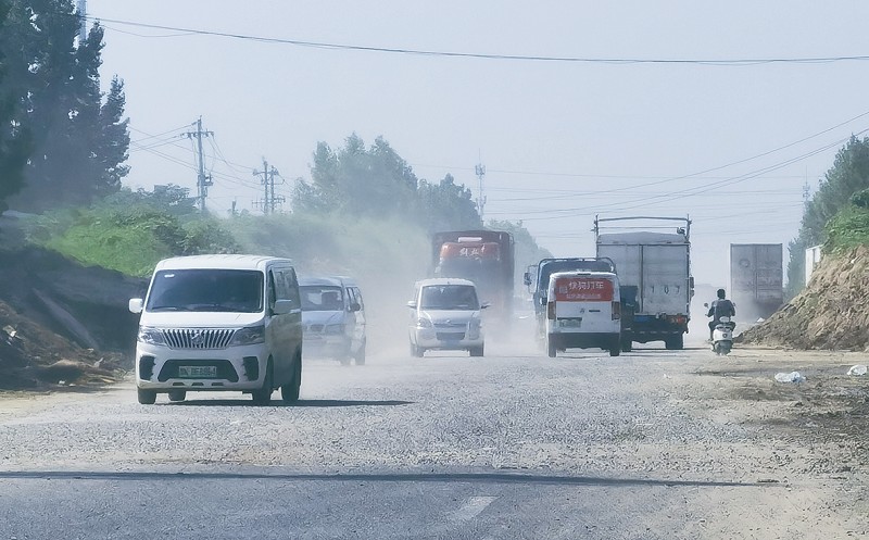 路边是堆积的黄土堆,上面长着很高的各种杂草。路基虽然铺了压实过的碎石子,但路面坑洼不平和小水坑让过往的车辆行人减速。两侧土堆的最窄处路段目测不到10米,对向行驶的大型车辆只能缓慢会车通过。