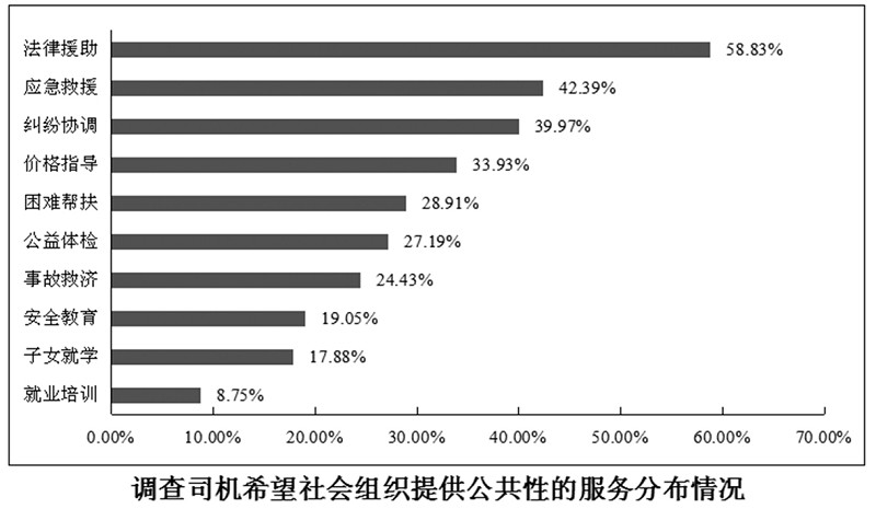 调查数据显示,货车司机希望各类社会组织提供的公共性服务主要集中在维权类服务、救援类服务、价格类服务、救济性服务和社保类服务五个方面。在维权类服务中,法律援助占比最高,达到58.83%;其次为纠纷协调占比为39.97%;在救援类服务,主要集中在应急救援需求方面占比为42.39%,也是较为普遍的服务需求。在价格类服务中,占比最多的为价格指导方面的服务,需求占比为33.93%。在救济性服务中,困难帮扶、事故救济占比较多,均在20%以上。在社保类服务中,公益体检服务占比较大,达到27.19%,其次为安全教育、子女就学和就业培训。