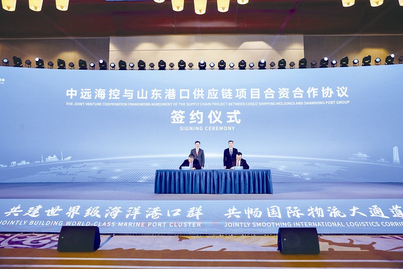 本报讯 8月27日,世界级海洋港口群暨国际物流大通道建设推进会在青岛召开。此次大会发布了行动宣言、倡议、指数、研究报告等具体务实举措,将习近平总书记的重要指示要求落实落地。 会上,中远海控与山东港口供应链项目合资合作协议签约,此次“港”“航”巨擘再度携手,汇聚资源优势,将打造功能高度集成的港航数字供应链公共服务平台,引领全球供应链变革新浪潮。(相关内容见3版)