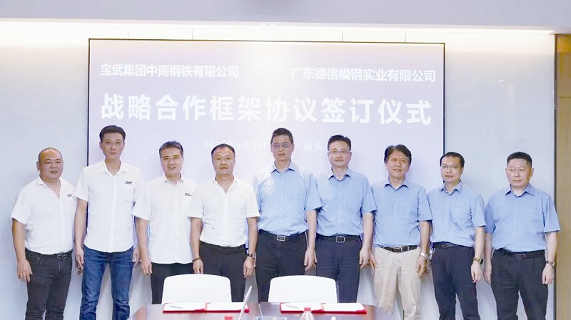 本报讯9月3日,宝武集团中南钢铁有限公司(以下简称:中南钢铁)与广东德信模钢实业有限公司(以下简称:德信模钢)在广东汕头签订战略合作协议,双方将在中厚板品种的供应和服务、技术研发及供应链延伸等方面开展深度合作,促进双方共同发展,共同构建钢铁供应链生态圈。