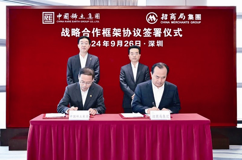 本报讯 9月26日下午,招商局集团与中国稀土集团在深圳招商局广场签署战略合作框架协议。招商局集团董事长缪建民、中国稀土集团董事长敖宏出席并见证签约。