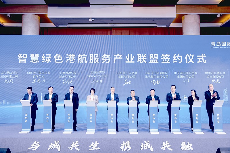 会上,山东港口各直属单位与各方合作伙伴共同签署系列重磅项目,签约项目达25个。其中,山东港口青岛港、投控集团、物流集团、贸易集团、科技集团与交通运输部水运科学研究院、中国船级社质量认证有限公司、中国船舶燃料有限责任公司青岛公司、中国石化燃料油销售有限公司、中远海运科技股份有限公司共同签约成立智慧绿色港航服务产业联盟。