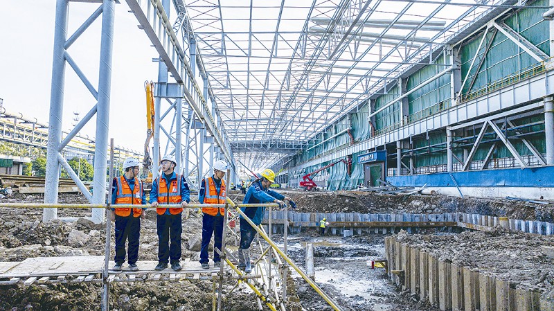 图为项目部技术人员在马钢冷轧6号镀锌线施工现场讨论区域基坑的下一步施工安排及支护体系的控制要点。